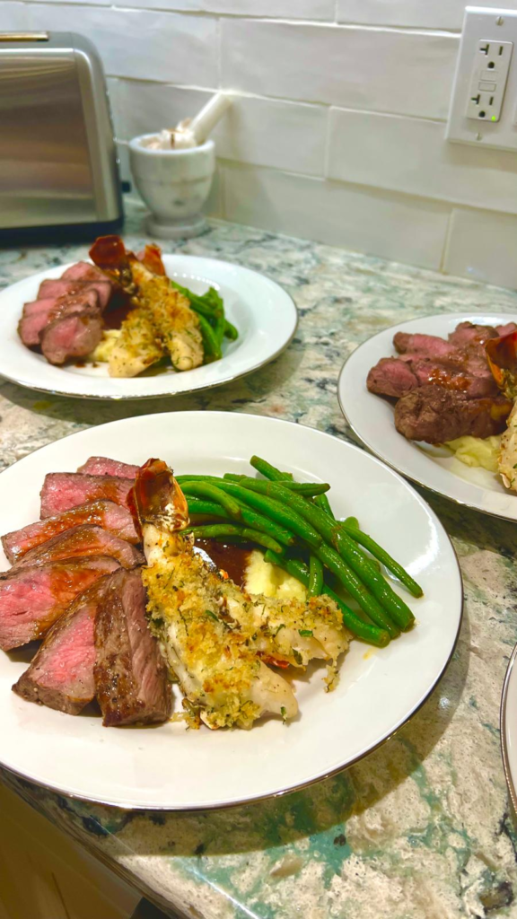 Garlic crusted lobster, Steak covered in bourdelaise, mashed potatoes, green beans