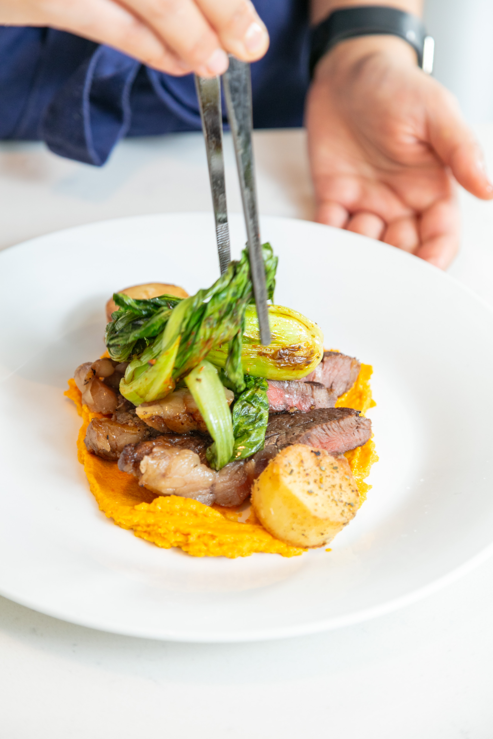 Steak au poivre, grilled broccolini and king oyster, dauphinoise potatoes